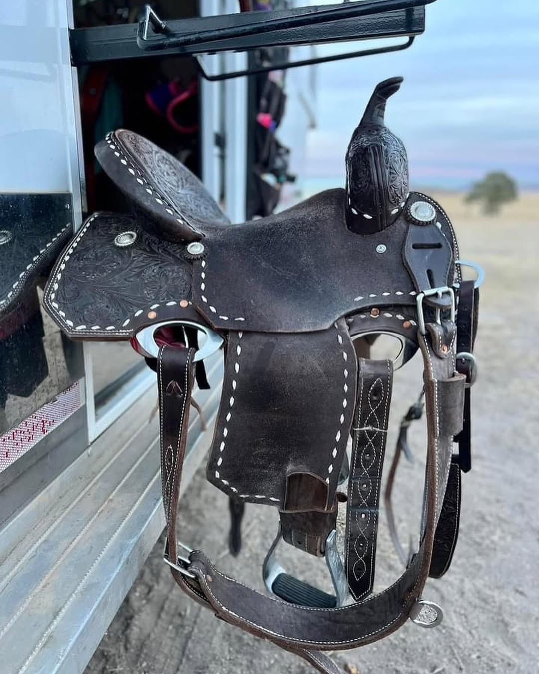 It has a Hard seat but super comfy and keeps you in. All it needs is to be re-roughed out. It will come with a matching breast collar and one ear headstall. It has one piece of buckstitch that split but everything else is all good!